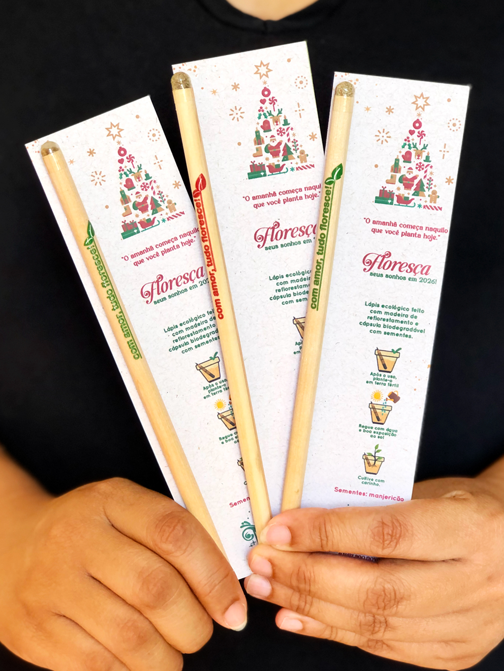 - Para finalizar sua compra adicione no campo "Informações de personalização" a frase e cor que pretende colocar no lápis com sementes.